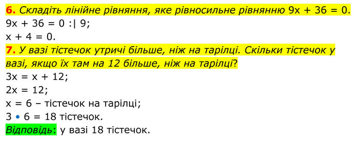 6. Складіть лінійне рівняння, яке рівносильне рівнянню 9х + 36 = 0. 9х + 36 = 0 :| 9; х + 4 = 0. 7. У вазі тістечок утричі більше, ніж на тарілці. Скільки тістечок у вазі, якщо їх там на 12 більше, ніж на тарілці? 3х = х + 12; 2х = 12; х = 6 – тістечок на тарілці; 3 • 6 = 18 тістечок. Відповідь: у вазі 18 тістечок.