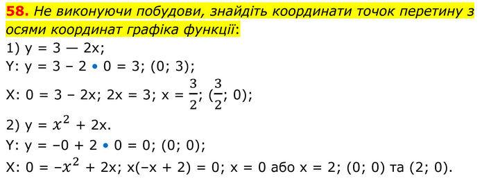 He виконуючи побудови, знайдіть координати точок перетину з осями координат графіка функції: 1) у = 3 — 2х; Y: y = 3 – 2 • 0 = 3; (0; 3); X: 0 = 3 – 2x; 2x = 3; x = 3/2; (3/2; 0); 2) у = x^2 + 2х. Y: y = –0 + 2 • 0 = 0; (0; 0); X: 0 = –x^2 + 2x; x(–x + 2) = 0; x = 0 або x = 2; (0; 0) та (2; 0).