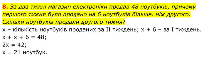 За два тижні магазин електроніки продав 48 ноутбуків, причому першого тижня було продано на 6 ноутбуків більше, ніж другого. Скільки ноутбуків продали другого тижня? х – кількість ноутбуків проданих за ІІ тиждень; х + 6 – за І тиждень. х + х + 6 = 48; 2х = 42; х = 21 ноутбук.