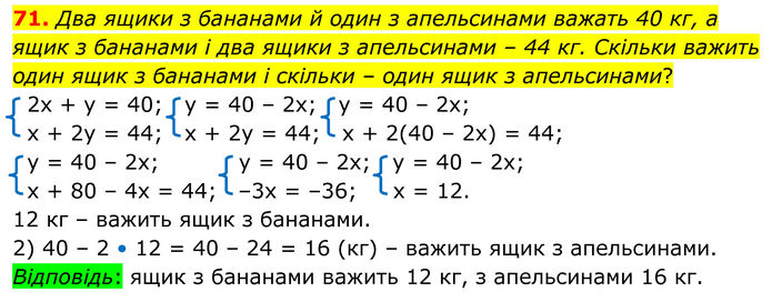 Два ящики з бананами й один з апельсинами важать 40 кг, а ящик з бананами і два ящики з апельсинами – 44 кг. Скільки важить один ящик з бананами і скільки – один ящик з апельсинами?