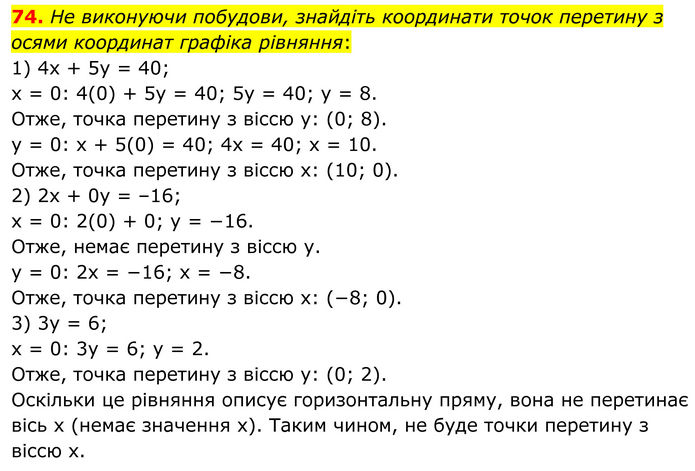 He виконуючи побудови, знайдіть координати точок перетину з осями координат графіка рівняння: 1) 4х + 5у = 40; x = 0: 4(0) + 5y = 40; 5y = 40; y = 8. Отже, точка перетину з віссю y: (0; 8). y = 0: x + 5(0) = 40; 4x = 40; x = 10. Отже, точка перетину з віссю x: (10; 0). 2) 2х + 0y = –16; x = 0: 2(0) + 0; y = −16. Отже, немає перетину з віссю y. у = 0: 2x = −16; x = −8. Отже, точка перетину з віссю x: (−8; 0). 3) 3y = 6; x = 0: 3y = 6; y = 2. Отже, точка перетину з віссю y: (0; 2). Оскільки це рівняння описує горизонтальну пряму, вона не перетинає вісь x (немає значення x). Таким чином, не буде точки перетину з віссю x.