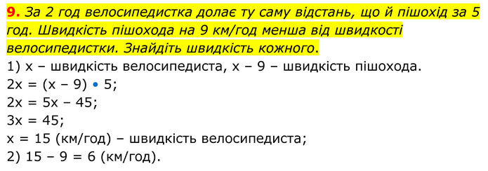 За 2 год велосипедистка долає ту саму відстань, що й пішохід за 5 год. Швидкість пішохода на 9 км/год менша від швидкості велосипедистки. Знайдіть швидкість кожного. 1) х – швидкість велосипедиста, х – 9 – швидкість пішохода. 2х = (х – 9) • 5; 2х = 5х – 45; 3х = 45; х = 15 (км/год) – швидкість велосипедиста; 2) 15 – 9 = 6 (км/год).