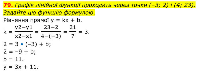 Графік лінійної функції проходить через точки (–3; 2) і (4; 23). Задайте цю функцію формулою. Рівняння прямої y = kx + b. k = (y2-y1)/(x2-x1) = (23-2)/(4-(-3)) = 21/7 = 3. 2 = 3 • (–3) + b; 2 = –9 + b; b = 11. y = 3x + 11.