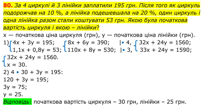 За 4 циркулі й 3 лінійки заплатили 195 грн. Після того як циркуль подорожчав на 10 %, а лінійка подешевшала на 20 %, один циркуль і одна лінійка разом стали коштувати 53 грн. Якою була початкова вартість циркуля і якою – лінійки?
