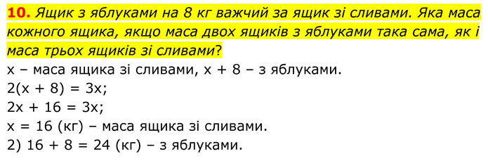 Ящик з яблуками на 8 кг важчий за ящик зі сливами. Яка маса кожного ящика, якщо маса двох ящиків з яблуками така сама, як і маса трьох ящиків зі сливами? х – маса ящика зі сливами, х + 8 – з яблуками. 2(х + 8) = 3х; 2х + 16 = 3х; х = 16 (кг) – маса ящика зі сливами. 2) 16 + 8 = 24 (кг) – з яблуками.