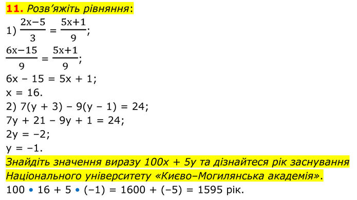 Розв’яжіть рівняння: 1) (2х-5)/3 = (5х+1)/9; (6х-15)/9 = (5х+1)/9; 6х – 15 = 5х + 1; х = 16. 2) 7(у + 3) – 9(у – 1) = 24; 7у + 21 – 9у + 1 = 24; 2у = –2; у = –1. Знайдіть значення виразу 100x + 5у та дізнайтеся рік заснування Національного університету «Києво–Могилянська академія». 100 • 16 + 5 • (–1) = 1600 + (–5) = 1595 рік.