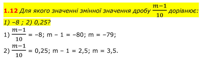 Для якого значенні змінної значення дробу (m-1)/10 дорівнює: 1) –8 ; 2) 0,25? 1) (m-1)/10 = –8; m – 1 = –80; m = –79; 2) (m-1)/10 = 0,25; m – 1 = 2,5; m = 3,5.