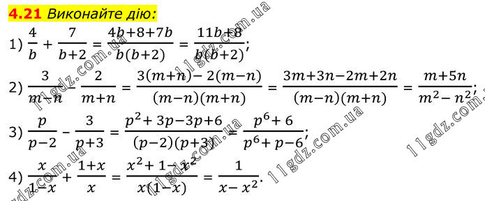 Виконайте дію: 1) 4/b + 7/(b+2) = (4b+8+7b)/(b(b+2)) = (11b+8)/(b(b+2)); 2) 3/(m-n) – 2/(m+n) = (3(m+n)- 2(m-n))/((m-n)(m+n)) = (3m+3n-2m+2n)/((m-n)(m+n)) = (m+5n)/(m^2- n^2 ); 3) p/(p-2) – 3/(p+3) = (p^2+ 3p-3p+6)/((p-2)(p+3)) = (p^6+ 6)/(p^6+ p-6); 4) x/(1-x) + (1+x)/x = (x^2+ 1- x^2)/(x(1-x)) = 1/(x- x^2 ).
