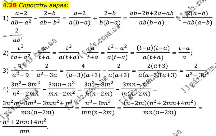 Спростіть вираз: 1) (a+4)/(ab- a^2 ) + (b+4)/(ab- b^2 ) = (a+4)/(a(b-a)) – (b+4)/(b(b-a)) = (ab+4b-ab-4a)/(ab(b-a)) = (4(b-a))/(ab(b-a)) = 4/ab; 2) m^2/(mx- x^2 ) + x/(x-m) = m^2/(x(m-x)) – x/(m-x) = (m^2- x^2)/(x(m-x)) = ((m-x)(m+x))/(x(m-x)) = (m+x)/x; 3) 2/(x^2- 4) – 1/(x^2+ 2x) = 2/((x-2)(x+2)) – 1/(x(x+2)) = (2x-(x-2))/(x(x-2)(x+2)) = (2x-x+2)/(x(x-2)(x+2)) = (x+2)/(x(x-2)(x+2)) = 1/(x^2- 2x); 4) (3ab-27a^2)/(b^2- 3ab) – (3a^2- b^2)/(ab-3a^2 ) = (3ab-27a^2)/(b(b-3a)) – (3a^2- b^2)/(a(b-3a)) = (3a^2 b-27a^3- 3a^2 b+ b^3)/(ab(b-3a)) = (b^2+ 27a^3)/(ab(b-3a)) = ((b-3a)(b^2+ 3ab+ 9a^2))/(ab(b-3a)) = (b^2+ 3ab+9a^2)/ab.