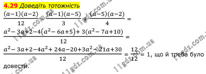 Доведіть тотожність ((a-1)(a-2))/12 – ((a-1)(a-5))/3 + ((a-5)(a-2))/4 = (a^2- 3a+2-4(a^2- 6a+5)+ 3(a^2- 7a+10))/12 = (a^2- 3a+2-4a^2+ 24a-20+3a^2- 21a+30)/12 = 12/12 = 1, що й треба було довести.