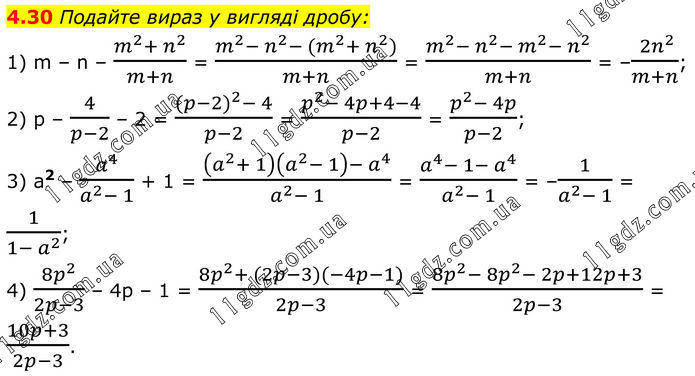 Подайте вираз у вигляді дробу: 1) m – n – (m^2+ n^2)/(m+n) = (m^2- n^2- (m^2+ n^2))/(m+n) = (m^2- n^2- m^2- n^2)/(m+n) = –( 2n^2)/(m+n); 2) p – 4/(p-2) – 2 = ((p-2)^2- 4)/(p-2) = (p^2- 4p+4-4)/(p-2) = (p^2- 4p)/(p-2); 3) a2 – a^4/(a^2- 1) + 1 = ((a^2+ 1)(a^2- 1)- a^4)/(a^2- 1) = (a^4- 1- a^4)/(a^2- 1) = –1/(a^2- 1) = 1/〖1- a〗^2 ; 4) (8p^2)/(2p-3) – 4p – 1 = (8p^2+ (2p-3)(-4p-1))/(2p-3) = (8p^2- 8p^2- 2p+12p+3)/(2p-3) = (10p+3)/(2p-3).