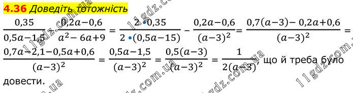 Доведіть тотожність 0,35/(0,5a-1,5) – (0,2a-0,6)/(a^2- 6a+9) = (2 •0,35)/(2 •(0,5a-15)) – (0,2a-0,6)/((a-3)^2 )= (0,7(a-3)- 0,2a+0,6)/((a-3)^2 ) = (0,7a-2,1-0,5a+0,6)/((a-3)^2 ) = (0,5a-1,5)/((a-3)^2 ) = (0,5(a-3))/((a-3)^2 ) = 1/(2(a-3)), що й треба було довести.