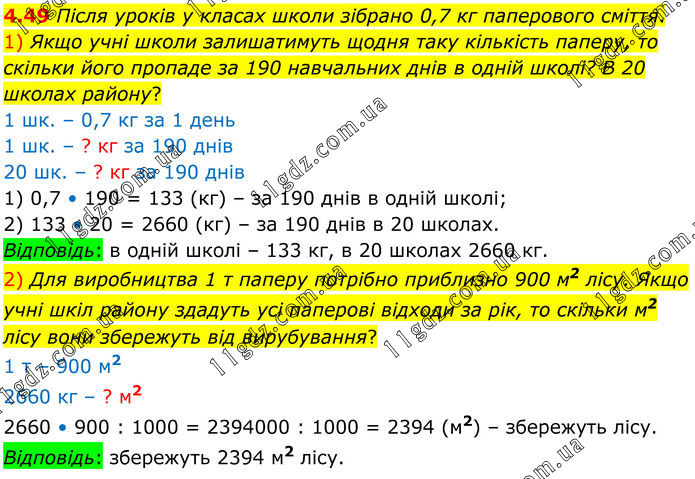Після уроків у класах школи зібрано 0,7 кг паперового сміття. 1) Якщо учні школи залишатимуть щодня таку кількість паперу, то скільки його пропаде за 190 навчальних днів в одній школі? В 20 школах району? 1 шк. – 0,7 кг за 1 день 1 шк. – ? кг за 190 днів 20 шк. – ? кг за 190 днів 1) 0,7 • 190 = 133 (кг) – за 190 днів в одній школі; 2) 133 • 20 = 2660 (кг) – за 190 днів в 20 школах. Відповідь: в одній школі – 133 кг, в 20 школах 2660 кг. 2) Для виробництва 1 т паперу потрібно приблизно 900 м2 лісу. Якщо учні шкіл району здадуть усі паперові відходи за рік, то скільки м2 лісу вони збережуть від вирубування? 1 т – 900 м2 2660 кг – ? м2 2660 • 900 : 1000 = 2394000 : 1000 = 2394 (м2) – збережуть лісу. Відповідь: збережуть 2394 м2 лісу.