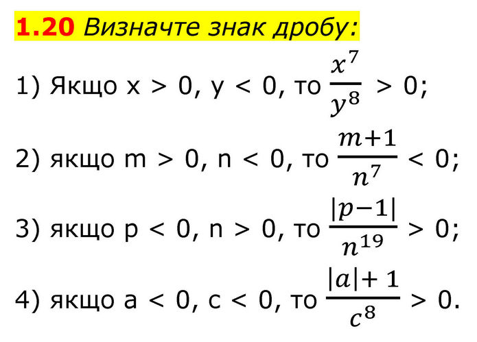 Визначте знак дробу: 1) Якщо x > 0, у < 0, то x^7/y^8 > 0; 2) якщо m > 0, n < 0, то (m+1)/n^7 < 0; 3) якщо р < 0, n > 0, то (|p-1|)/n^19 > 0; 4) якщо a < 0, c < 0, то (|a|+ 1)/c^8 > 0.