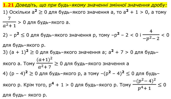 Доведіть, що при будь–якому значенні змінної значення дробу: 1) Оскільки а2 ≥ 0 для будь–якого значення а, то а2 + 1 > 0, а тому 7/(a^2+ 1) > 0 для будь–якого а. 2) – р2 ≤ 0 для будь–якого значення р, тому –р2 – 2 < 0 і 4/(〖-p〗^2- 2) < 0 для будь–якого р. 3) (а + 1)2 ≥ 0 для будь–якого значення а; а2 + 7 > 0 для будь–якого а. Тому ((a+1)^2)/(a^2+ 7) ≥ 0 для будь–якого значення а 4) (р – 4)2 ≥ 0 для будь–якого p, а тому –(р2 – 4)2 ≤ 0 для будь–якого р. Крім того, р4 + 1 > 0 для будь–якого р. Тому (-(p^2- 4)^2)/(p^4+ 1) ≤ 0 для будь– якого р.