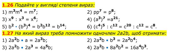 1.26 Подайте у вигляді степеня вираз: 1) m3m4 = m7; 3) x9 : x3 = x6; 5) b2 • (b3)4 = b2b12 = b14; 2) pp7 = p8; 4) (а3)7 =a21; 6) (с4)5 : с12 = с20 : c12 = c8. 1.27 На який вираз треба помножити одночлен 2а2b, щоб отримати: 1) 2а2b • a = 2а3b; 3) 2а2b • 2а3 = 4а5b; 2) 2а2b • b3 = 2а2b4; 4) 2а2b • 8а2b2 = 16а4b3.