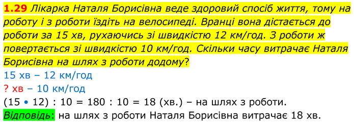 Лікарка Наталя Борисівна веде здоровий спосіб життя, тому на роботу і з роботи їздіть на велосипеді. Вранці вона дістається до роботи за 15 хв, рухаючись зі швидкістю 12 км/год. З роботи ж повертається зі швидкістю 10 км/год. Скільки часу витрачає Наталя Борисівна на шлях з роботи додому? 15 хв – 12 км/год ? хв – 10 км/год (15 • 12) : 10 = 180 : 10 = 18 (хв.) – на шлях з роботи. Відповідь: на шлях з роботи Наталя Борисівна витрачає 18 хв.
