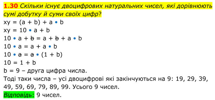 Скільки існує двоцифрових натуральних чисел, які дорівнюють сумі добутку й суми своїх цифр? xy = (a + b) + a • b xy = 10 • a + b 10 • a + b = a + b + a • b 10 • a = a + a • b 10 • a = a • (1 + b) 10 = 1 + b b = 9 – друга цифра числа. Тоді таки числа – усі двоцифрові які закінчуються на 9: 19, 29, 39, 49, 59, 69, 79, 89, 99. Усього 9 чисел. Відповідь: 9 чисел.