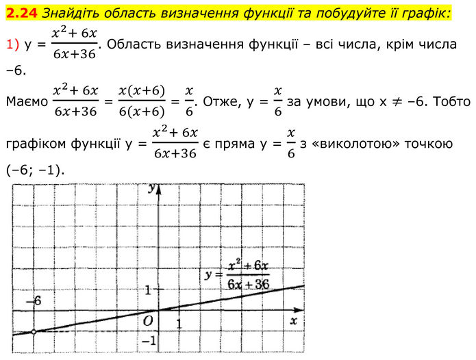 Знайдіть область визначення функції та побудуйте її графік: 1) y = (x^2+ 6x)/(6x+36). Область визначення функції – всі числа, крім числа –6. Маємо (x^2+ 6x)/(6x+36) = (x(x+6))/(6(x+6)) = x/6. Отже, у = x/6 за умови, що х ≠ –6. Тобто графіком функції у = (x^2+ 6x)/(6x+36) є пряма у = x/6 з «виколотою» точкою (–6; –1).