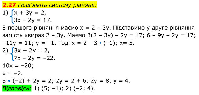 Розв’яжіть систему рівнянь: 1) х + 3у = 2, 3х – 2у = 17. З першого рівняння маємо х = 2 – 3у. Підставимо у друге рівняння замість хвираз 2 – Зу. Маємо 3(2 – Зу) – 2y = 17; 6 – 9y – 2у = 17; –11у = 11; у = –1. Тоді х = 2 – 3 • (–1); х= 5. 2) Зх + 2у = 2, 7х – 2у = –22. 10x = –20; х = –2. З • (–2) + 2у = 2; 2у = 2 + 6; 2у = 8; у = 4. Відповідь: 1) (5; –1); 2) (–2; 4).