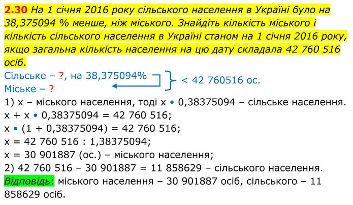 На 1 січня 2016 року сільського населення в Україні було на 38,375094 % менше, ніж міського. Знайдіть кількість міського і кількість сільського населення в Україні станом на 1 січня 2016 року, якщо загальна кількість населення на цю дату складала 42 760 516 осіб. Сільське – ?, на 38,375094% Міське – ? 1) х – міського населення, тоді х • 0,38375094 – сільське населення. х + х • 0,38375094 = 42 760 516; х • (1 + 0,38375094) = 42 760 516; х = 42 760 516 : 1,38375094; х = 30 901887 (ос.) – міського населення; 2) 42 760 516 – 30 901887 = 11 858629 – сільського населення. Відповідь: міського населення – 30 901887 осіб, сільського – 11 858629 осіб.