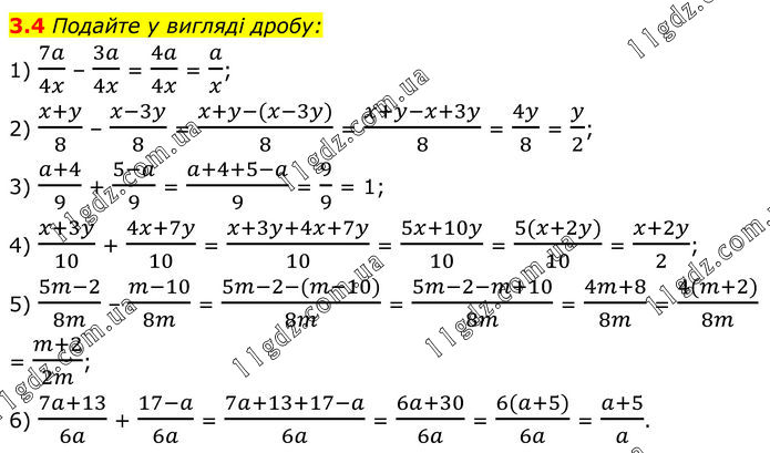 Подайте у вигляді дробу: 1) 7a/4x – 3a/4x = 4a/4x = a/x; 2) (x+y)/8 – (x-3y)/8 = (x+y-(x-3y))/8 = (x+y-x+3y)/8 = 4y/8 = y/2; 3) (a+4)/9 + (5-a)/9 = (a+4+5-a)/9 = 9/9 = 1; 4) (x+3y)/10 + (4x+7y)/10 = (x+3y+4x+7y)/10 = (5x+10y)/10 = (5(x+2y))/10 = (x+2y)/2; 5) (5m-2)/8m – (m-10)/8m = (5m-2-(m-10))/8m = (5m-2-m+10)/8m = (4m+8)/8m = (4(m+2))/8m = (m+2)/2m; 6) (7a+13)/6a + (17-a)/6a = (7a+13+17-a)/6a = (6a+30)/6a = (6(a+5))/6a = (a+5)/a.