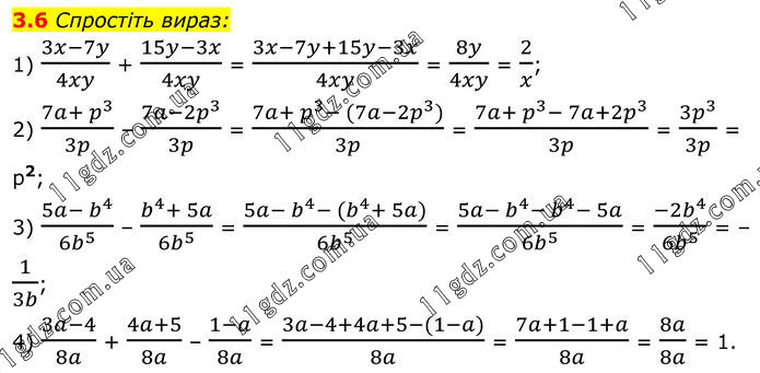 Спростіть вираз: 1) (3x-7y)/4xy + (15y-3x)/4xy = (3x-7y+15y-3x)/4xy = 8y/4xy = 2/x; 2) (7a+ p^3)/3p – (7a-2p^3)/3p = (7a+ p^3- (7a-2p^3))/3p = (7a+ p^3- 7a+2p^3)/3p = (3p^3)/3p = p2; 3) (5a- b^4)/(6b^5 ) – (b^4+ 5a)/(6b^5 ) = (5a- b^4- (b^4+ 5a))/(6b^5 ) = (5a- b^4- b^4- 5a)/(6b^5 ) = (-2b^4)/(6b^5 ) = –1/3b; 4) (3a-4)/8a + (4a+5)/8a – (1-a)/8a = (3a-4+4a+5-(1-a))/8a = (7a+1-1+a)/8a = 8a/8a = 1.