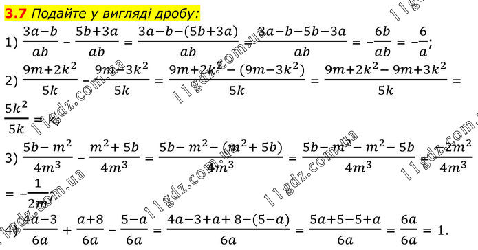 Подайте у вигляді дробу: 1) (3a-b)/ab – (5b+3a)/ab = (3a-b-(5b+3a))/ab = (3a-b-5b-3a)/ab = –6b/ab = –6/a; 2) (9m+2k^2)/5k – (9m-3k^2)/5k = (9m+2k^(2 )- (9m-3k^2))/5k = (9m+2k^2- 9m+3k^2)/5k = (5k^2)/5k = k; 3) (5b- m^2)/(4m^3 ) – (m^2+ 5b)/(4m^3 ) = (5b- m^2- (m^2+ 5b))/(4m^3 ) = (5b- m^2- m^2- 5b)/(4m^3 ) = (-2m^2)/(4m^3 ) = –1/2m; 4) (4a-3)/6a + (a+8)/6a – (5-a)/6a = (4a-3+a+ 8-(5-a))/6a = (5a+5-5+a)/6a = 6a/6a = 1.