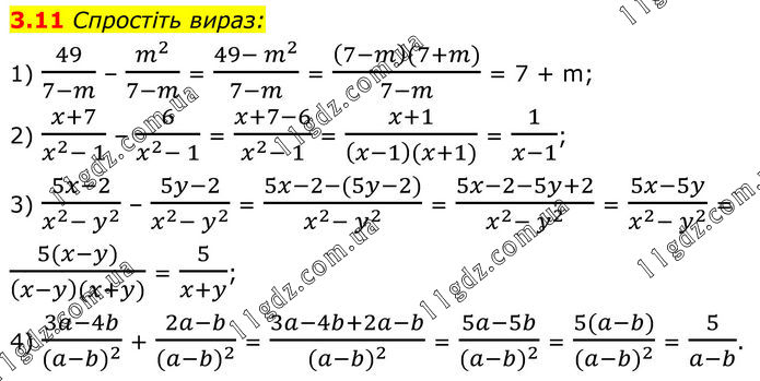Спростіть вираз: 1) 49/(7-m) – m^2/(7-m) = (49- m^2)/(7-m) = ((7-m)(7+m))/(7-m) = 7 + m; 2) (x+7)/(x^2- 1) – 6/(x^2- 1) = (x+7-6)/(x^2- 1) = (x+1)/((x-1)(x+1)) = 1/(x-1); 3) (5x-2)/(x^2- y^2 ) – (5y-2)/(x^2- y^2 ) = (5x-2-(5y-2))/(x^2- y^2 ) = (5x-2-5y+2)/(x^2- y^2 ) = (5x-5y)/(x^2- y^2 ) = (5(x-y))/((x-y)(x+y)) = 5/(x+y); 4) (3a-4b)/((a-b)^2 ) + (2a-b)/((a-b)^2 ) = (3a-4b+2a-b)/((a-b)^2 ) = (5a-5b)/((a-b)^2 ) = (5(a-b))/((a-b)^2 ) = 5/(a-b).