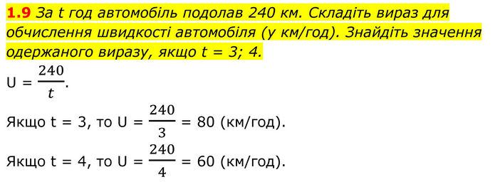 За t год автомобіль подолав 240 км. Складіть вираз для обчислення швидкості автомобіля (у км/год). Знайдіть значення одержаного виразу, якщо t = 3; 4. U = 240/t. Якщо t = 3, то U = 240/3 = 80 (км/год). Якщо t = 4, то U = 240/4 = 60 (км/год).