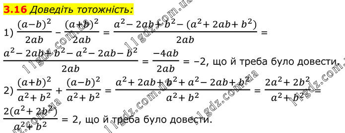 Доведіть тотожність: 1) ((a-b)^2)/2ab – ((a+b)^2)/2ab = (a^2- 2ab+ b^2- (a^2+ 2ab+ b^2))/2ab = (a^2- 2ab+ b^2- a^2- 2ab- b^2)/2ab = (-4ab)/2ab = –2, що й треба було довести. 2) ((a+b)^2)/(a^2+ b^2 ) + ((a-b)^2)/(a^2+ b^2 ) = (a^2+ 2ab+ b^2+ a^2- 2ab+ b^2)/(a^2+ b^2 ) = (2a^2+ 2b^2)/(a^2+ b^2 ) = (2(a^2+ 2b^2))/(a^2+ b^2 ) = 2, що й треба було довести.