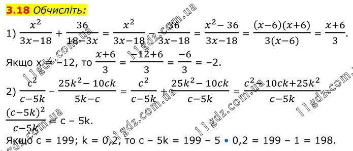 Обчисліть: 1) x^2/(3x-18) + 36/(18-3x) = x^2/(3x-18) – 36/(3x-18) = (x^2- 36)/(3x-18) = ((x-6)(x+6))/(3(x-6)) = (x+6)/3. Якщо х = –12, то (x+6)/3 = (-12+6)/3 = (-6)/3 = –2. 2) с^2/(c-5k) – (25k^2- 10ck)/(5k-c) = c^2/(c-5k) + (25k^2- 10ck)/(c-5k) = (c^2- 10ck+25k^2)/(c-5k) = ((c-5k)^2)/(c-5k) = c – 5k. Якщо с = 199; k = 0,2, то c – 5k = 199 – 5 • 0,2 = 199 – 1 = 198.