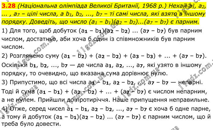 (Національна олімпіада Великої Британії, 1968 р.) Нехай a1, a2, ... , a7 – цілі числа, а b1, b2, ..., b7 – ті самі числа, які взято в іншому порядку. Доведіть, що число (a1 – b1)(a2 – b2)...(а7 – b7) є парним. 1) Для того, щоб добуток (a1 – b1)(а2 – b2) ... (а7 – b7) був парним числом, достатньо, аби хоча б один із співмножників був парним числом. 2) Розглянемо суму (а1 – b2) + (а2 – b2) + (а3 – b3) + ... + (а7 – b7). Оскільки b1, b2, ..., b7 — де числа a1, а2, ..., а7, які узято в іншому порядку, то очевидно, що вказана сума дорівнює нулю. 3) Припустимо, що всі числа a1 – b1, а2 – b2, ..., а7 – b7 — непарні. Тоді й сума (a1 – b1) + (а2 – b2) + ... + (а7 – b7) є числом непарним, а не нулем. Прийшли до протиріччя. Наше припущення неправильне. 4) Отже, серед чисел a1 – b1, a2 – b2, ..., a7 – b7 є хоча б одне парне, а тому й добуток (a1 – b1)(а2 – b2) ... (а7 – b7) є парним числом, що й треба було довести.
