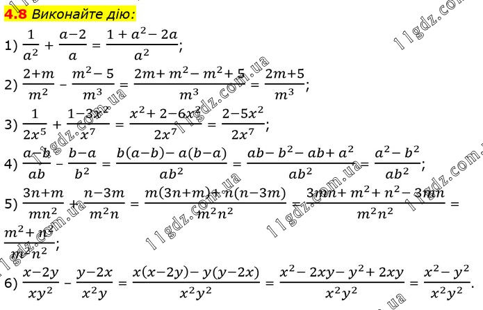 Виконайте дію: 1) 1/a^2 + (a-2)/a = (1 + a^2- 2a)/a^2 ; 2) (2+m)/m^2 – (m^2- 5)/m^3 = (2m+ m^2- m^2+ 5)/m^3 = (2m+5)/m^3 ; 3) 1/(2x^5 ) + (1-3x^2)/x^7 = (x^2+ 2-6x^2)/(2x^7 ) = (2-5x^2)/(2x^7 ); 4) (a-b)/ab – (b-a)/b^2 = (b(a-b)- a(b-a))/(ab^2 ) = (ab- b^2- ab+ a^2)/〖ab〗^2 = (a^2- b^2)/〖ab〗^2 ; 5) (3n+m)/〖mn〗^2 + (n-3m)/(m^2 n) = (m(3n+m)+ n(n-3m))/(m^2 n^2 ) = (3mn+ m^2+ n^2- 3mn)/(m^2 n^2 ) = (m^2+ n^2)/(m^2 n^2 ); 6) (x-2y)/(xy^2 ) – (y-2x)/(x^2 y) = (x(x-2y)- y(y-2x))/(x^2 y^2 ) = (x^2- 2xy- y^2+ 2xy)/(x^2 y^2 ) = (x^2- y^2)/(x^2 y^2 ).