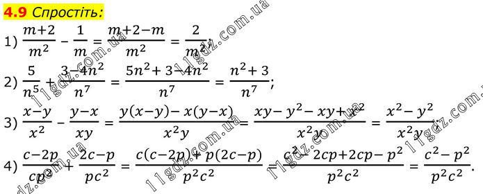 Спростіть: 1) (m+2)/m^2 – 1/m = (m+2-m)/m^2 = 2/m^2 ; 2) 5/n^5 + (3-4n^2)/n^7 = (5n^2+ 3-4n^2)/n^7 = (n^2+ 3)/n^7 ; 3) (x-y)/x^2 – (y-x)/xy = (y(x-y)- x(y-x))/(x^2 y) = (xy- y^2- xy+ x^2)/(x^2 y) = (x^2- y^2)/(x^2 y); 4) (c-2p)/(cp^2 ) + (2c-p)/(pc^2 ) = (c(c-2p)+ p(2c-p))/(p^2 c^2 ) = (c^2- 2cp+2cp- p^2)/(p^2 c^2 ) = (c^2- p^2)/(p^2 c^2 ).
