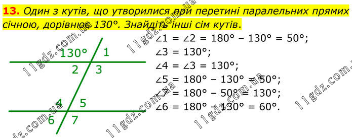 13. Один з кутів, що утворилися при перетині паралельних прямих січною, дорівнює 130°. Знайдіть інші сім кутів. ∠1 = ∠2 = 180° – 130° = 50°; ∠3 = 130°; ∠4 = ∠3 = 130°; ∠5 = 180° – 130° = 50°; ∠7 = 180° – 50° = 130°; ∠6 = 180° – 130° = 60°.