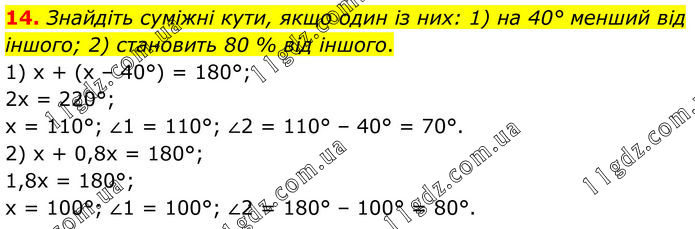14. Знайдіть суміжні кути, якщо один із них: 1) на 40° менший від іншого; 2) становить 80 % від іншого. 1) х + (х – 40°) = 180°; 2х = 220°; х = 110°; ∠1 = 110°; ∠2 = 110° – 40° = 70°. 2) х + 0,8х = 180°; 1,8х = 180°; х = 100°; ∠1 = 100°; ∠2 = 180° – 100° = 80°.