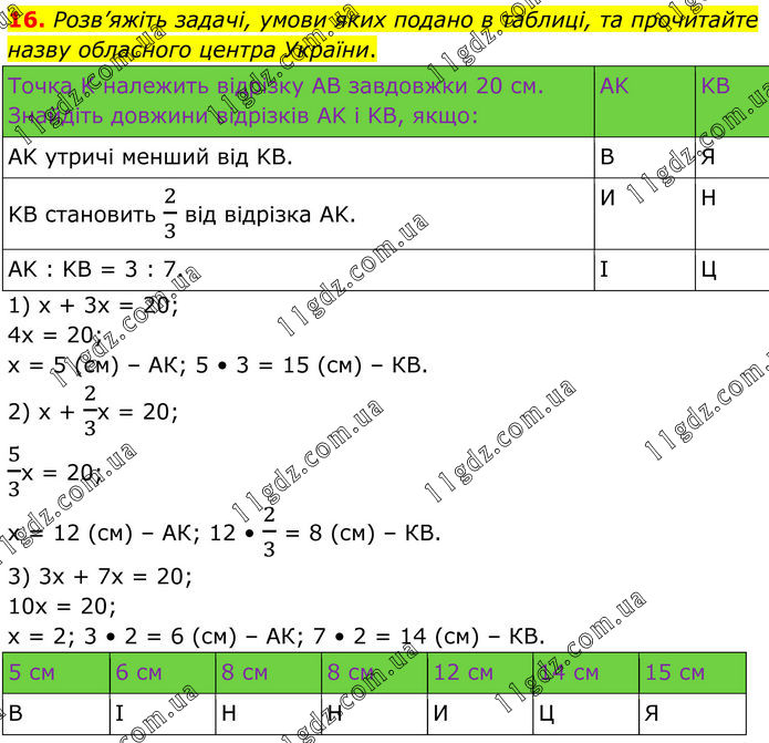 Розв’яжіть задачі, умови яких подано в таблиці, та прочитайте назву обласного центра України. Точка K належить відрізку AB завдовжки 20 см. Знайдіть довжини відрізків AK і KB, якщо: AK KB AK утричі менший від KB. В Я KB становить 2/3 від відрізка AK. И H AK : KB = 3 : 7. І Ц 1) х + 3х = 20; 4х = 20; х = 5 (см) – АК; 5 • 3 = 15 (см) – КВ. 2) х + 2/3х = 20; 5/3х = 20; х = 12 (см) – АК; 12 • 2/3 = 8 (см) – КВ. 3) 3х + 7х = 20; 10х = 20; х = 2; 3 • 2 = 6 (см) – АК; 7 • 2 = 14 (см) – КВ.