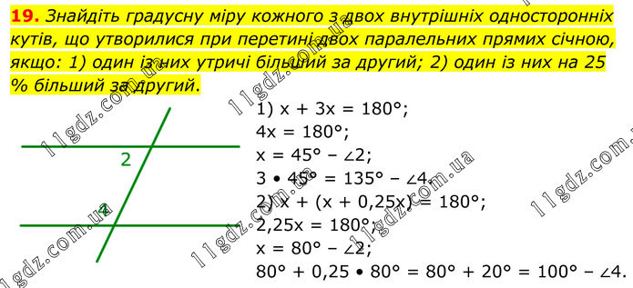 19. Знайдіть градусну міру кожного з двох внутрішніх односторонніх кутів, що утворилися при перетині двох паралельних прямих січною, якщо: 1) один із них утричі більший за другий; 2) один із них на 25 % більший за другий. 1) х + 3х = 180°; 4х = 180°; х = 45° – ∠2; 3 • 45° = 135° – ∠4. 2) х + (х + 0,25х) = 180°; 2,25х = 180°; х = 80° – ∠2; 80° + 0,25 • 80° = 80° + 20° = 100° – ∠4.