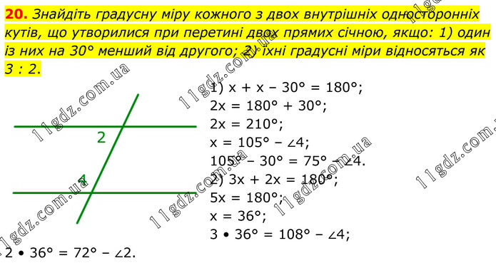 20. Знайдіть градусну міру кожного з двох внутрішніх односторонніх кутів, що утворилися при перетині двох прямих січною, якщо: 1) один із них на 30° менший від другого; 2) їхні градусні міри відносяться як 3 : 2. 1) х + х – 30° = 180°; 2х = 180° + 30°; 2х = 210°; х = 105° – ∠4; 105° – 30° = 75° – ∠4. 2) 3х + 2х = 180°; 5х = 180°; х = 36°; 3 • 36° = 108° – ∠4; 2 • 36° = 72° – ∠2.