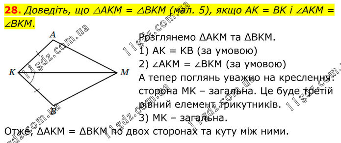 28. Доведіть, що △AKM = △BKM (мал. 5), якщо AK = BK і ∠AKM = ∠BKM. Розглянемо ΔAKM та ΔBKM. 1) AK = KB (за умовою) 2) ∠AKM = ∠BKM (за умовою) А тепер поглянь уважно на креслення: сторона MK – загальна. Це буде третій рівний елемент трикутників. 3) MK – загальна. Отже, ΔAKM = ΔBKM по двох сторонах та куту між ними.