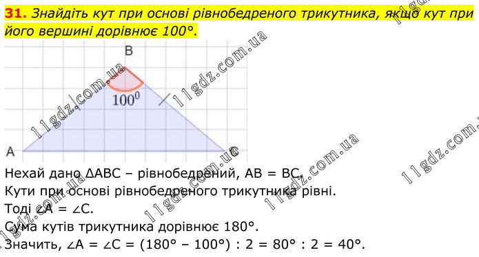 31. Знайдіть кут при основі рівнобедреного трикутника, якщо кут при його вершині дорівнює 100°. Нехай дано ΔАВС – рівнобедрений, АВ = ВС. Кути при основі рівнобедреного трикутника рівні. Тоді ∠А = ∠С. Сума кутів трикутника дорівнює 180°. Значить, ∠А = ∠С = (180° – 100°) : 2 = 80° : 2 = 40°.