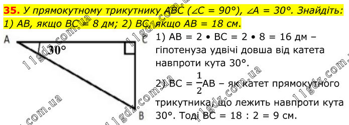 35. У прямокутному трикутнику ABC (∠C = 90°), ∠A = 30°. Знайдіть: 1) AB, якщо BC = 8 дм; 2) BC, якщо AB = 18 см. 1) АВ = 2 • ВС = 2 • 8 = 16 дм – гіпотенуза удвічі довша від катета навпроти кута 30°. 2) ВС = 1/2АВ – як катет прямокутного трикутника, що лежить навпроти кута 30°. Тоді ВС = 18 : 2 = 9 см.