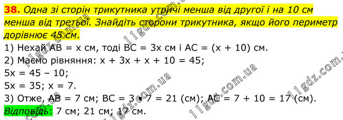 38. Одна зі сторін трикутника утричі менша від другої і на 10 см менша від третьої. Знайдіть сторони трикутника, якщо його периметр дорівнює 45 см. 1) Нехай AB = х см, тоді BC = 3х см і AC = (х + 10) см. 2) Маємо рівняння: x + 3x + x + 10 = 45; 5х = 45 – 10; 5х = 35; х = 7. 3) Отже, AB = 7 см; BC = 3 • 7 = 21 (см); AC = 7 + 10 = 17 (см). Відповідь: 7 см; 21 см; 17 см.