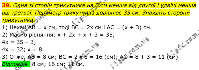 39. Одна зі сторін трикутника на 3 см менша від другої і удвічі менша від третьої. Периметр трикутника дорівнює 35 см. Знайдіть сторони трикутника. 1) Нехай AB = х см, тоді BC = 2х см і AC = (х + 3) см. 2) Маємо рівняння: x + 2x + x + 3 = 35; 4х = 35 – 3; 4х = 32; х = 8. 3) Отже, AB = 8 см; BC = 2 • 8 = 16 (см); AC = 8 + 3 = 11 (см). Відповідь: 8 см; 16 см; 11 см.