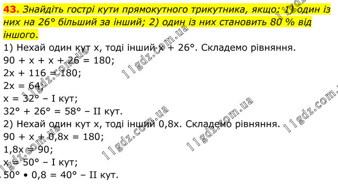 43. Знайдіть гострі кути прямокутного трикутника, якщо: 1) один із них на 26° більший за інший; 2) один із них становить 80 % від іншого. 1) Нехай один кут х, тоді інший х + 26°. Складемо рівняння. 90 + х + х + 26 = 180; 2х + 116 = 180; 2х = 64; х = 32° – І кут; 32° + 26° = 58° – ІІ кут. 2) Нехай один кут х, тоді інший 0,8х. Складемо рівняння. 90 + х + 0,8х = 180; 1,8х = 90; х = 50° – І кут; 50° • 0,8 = 40° – ІІ кут.