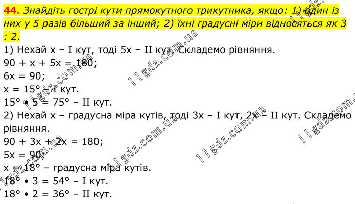44. Знайдіть гострі кути прямокутного трикутника, якщо: 1) один із них у 5 разів більший за інший; 2) їхні градусні міри відносяться як 3 : 2. 1) Нехай х – І кут, тоді 5х – ІІ кут. Складемо рівняння. 90 + х + 5х = 180; 6х = 90; х = 15° – І кут. 15° • 5 = 75° – ІІ кут. 2) Нехай х – градусна міра кутів, тоді 3х – І кут, 2х – ІІ кут. Складемо рівняння. 90 + 3х + 2х = 180; 5х = 90; х = 18° – градусна міра кутів. 18° • 3 = 54° – І кут. 18° • 2 = 36° – ІІ кут.