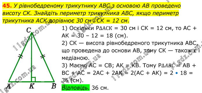 45. У рівнобедреному трикутнику ABC з основою AB проведено висоту CK. Знайдіть периметр трикутника ABC, якщо периметр трикутника ACK дорівнює 30 см і CK = 12 см. 1) Оскільки Р∆АСК = 30 см і СК = 12 см, то AС + AК = 30 – 12 = 18 (см). 2) СК — висота рівнобедреного трикутника ABC, що проведена до основи АВ, тому СК — також є і медіаною. 3) Маємо АС = СB; АК = КВ. Тому P∆ABС = AB + BC + АС = 2AС + 2AК = 2(AС + AК) = 2 • 18 = 36 (см). Відповідь. 36 см.