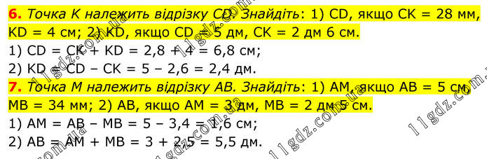 6. Точка K належить відрізку CD. Знайдіть: 1) CD, якщо CK = 28 мм, KD = 4 см; 2) KD, якщо CD = 5 дм, CK = 2 дм 6 см. 1) CD = СК + KD = 2,8 + 4 = 6,8 см; 2) KD = CD – CK = 5 – 2,6 = 2,4 дм. 7. Точка M належить відрізку AB. Знайдіть: 1) AM, якщо AB = 5 см, MB = 34 мм; 2) AB, якщо AM = 3 дм, MB = 2 дм 5 см. 1) АМ = АВ – МВ = 5 – 3,4 = 1,6 см; 2) АВ = АМ + МВ = 3 + 2,5 = 5,5 дм.