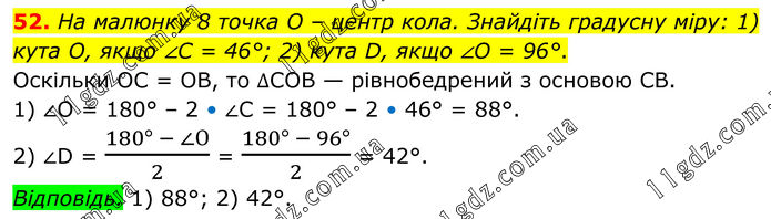 52. На малюнку 8 точка O – центр кола. Знайдіть градусну міру: 1) кута O, якщо ∠C = 46°; 2) кута D, якщо ∠O = 96°. Оскільки OС = OВ, то ∆СOВ — рівнобедрений з основою СВ. 1) ∠O = 180° – 2 • ∠С = 180° – 2 • 46° = 88°. 2) ∠D = (180° - ∠О)/2 = (180° - 96°)/2 = 42°. Відповідь. 1) 88°; 2) 42°.